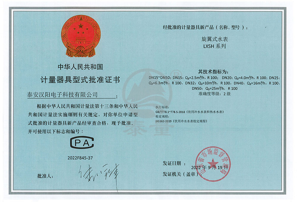 電子遠(yuǎn)傳水表型評(píng)證書(shū)